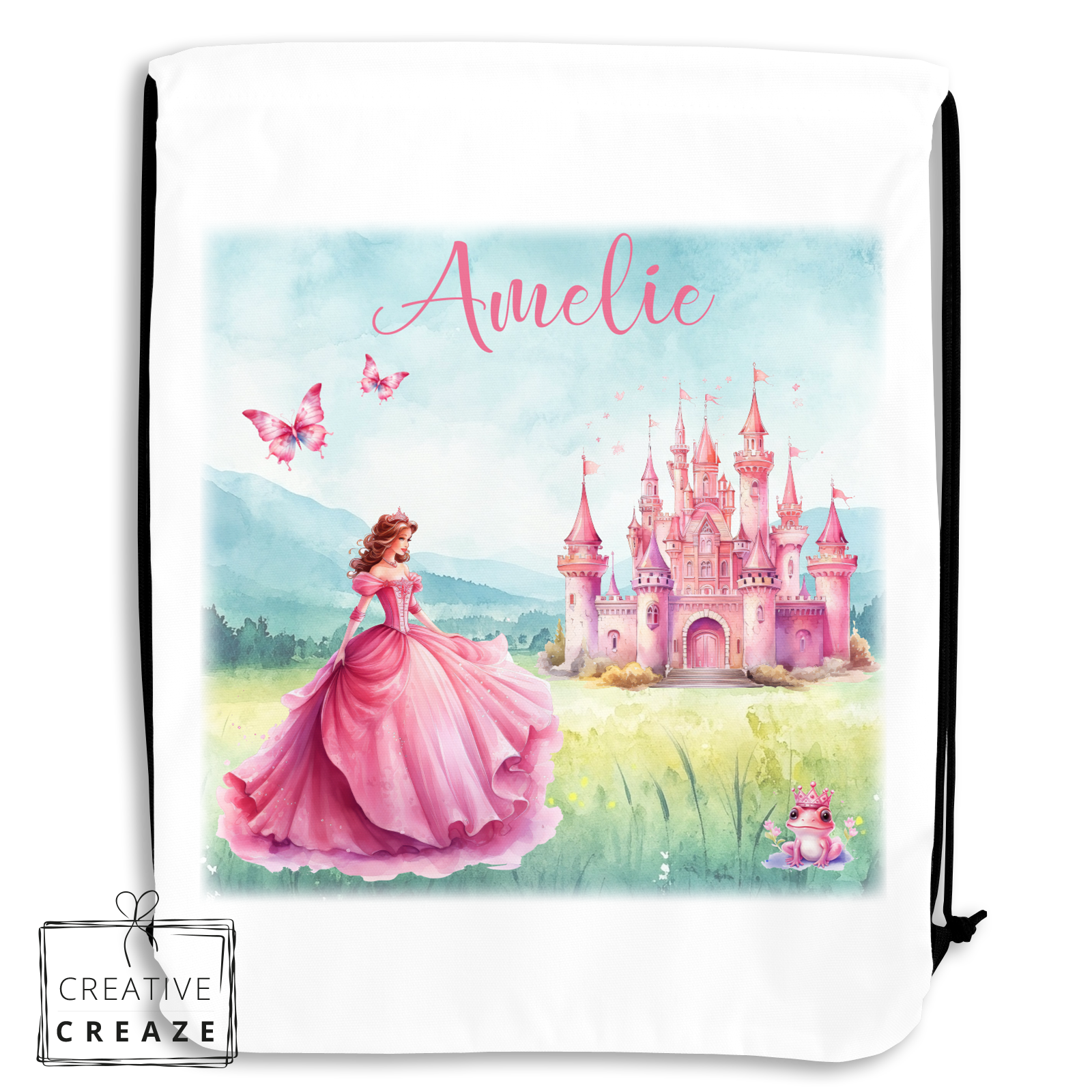 OverzichtTurn- of zwemzakje met jouw naam en een prinses met kasteel.
